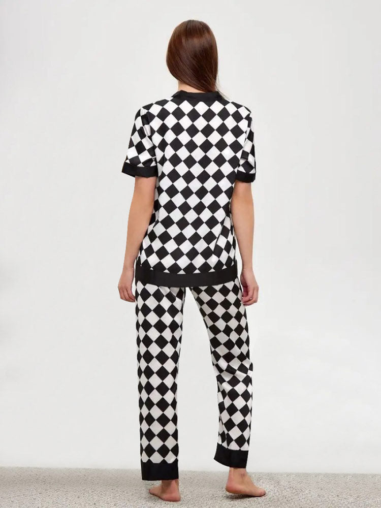 Elevate your bedtime routine with our Luxurious Short Sleeve Plaid Pajama Set, designed for the epitome of comfort and sophistication. Featuring short sleeves and long pants, this pajama set boasts a timeless black and white plaid design that exudes understated elegance. Crafted for the modern woman with discerning taste, it offers unparalleled luxury and style for your nightly retreat.